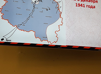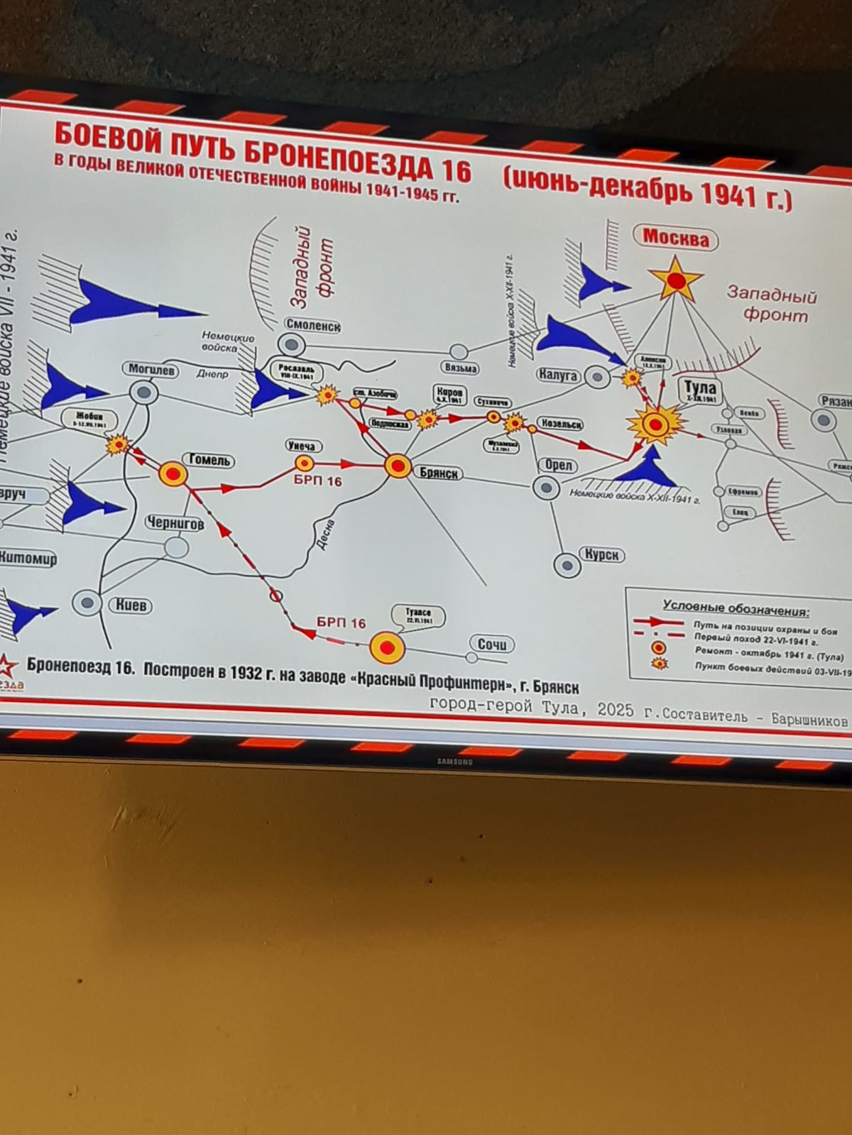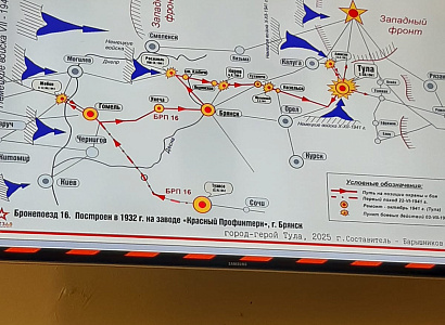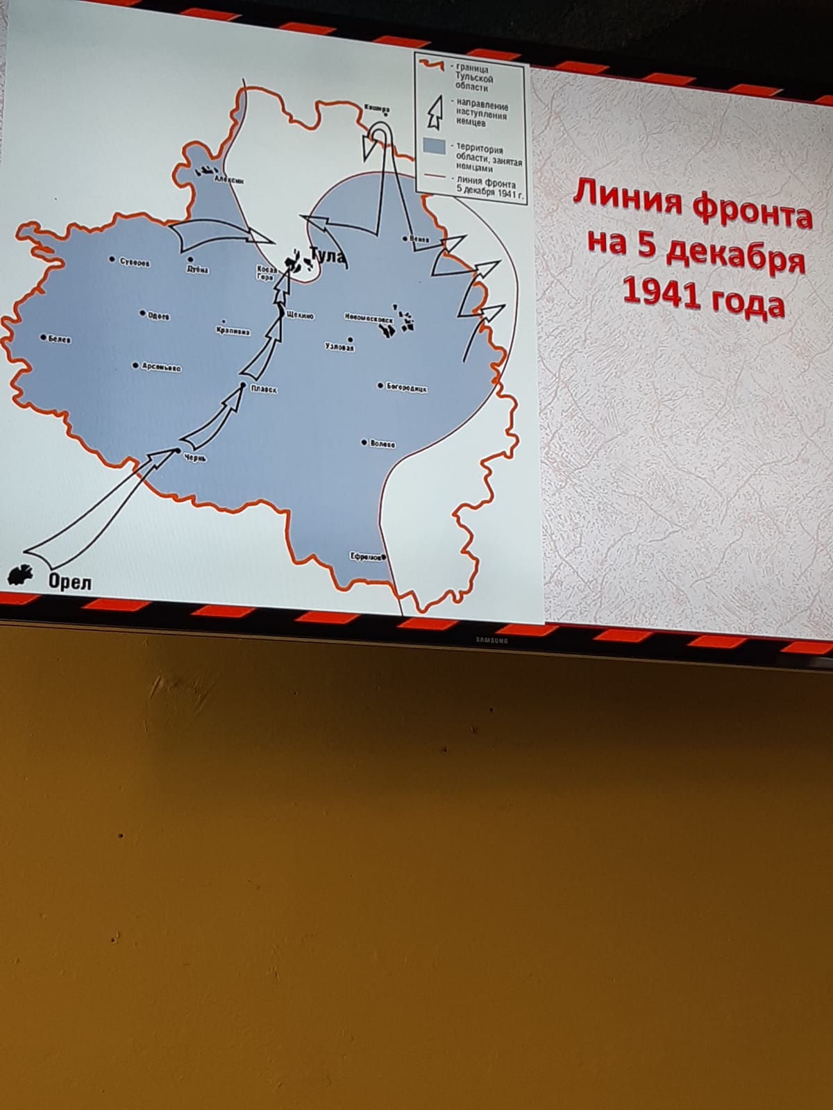 Рассказ сопровождался слайдами на экране: фото бронепоездов, эпизоды сражений, карты и схемы обороны Тулы, фото личного состава.