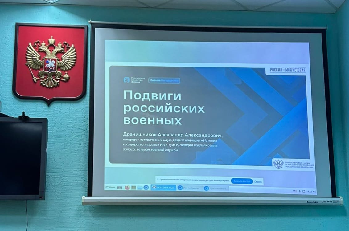 21 ноября 2024 года, в преддверии Дня героев Отечества, отмечаемого 9 декабря, лектор Всероссийской общественной организации «Общество «Знание», член Тульской региональной общественной организации "Ветеран", кандидат исторических наук, доцент кафедры кафедры ИГиП ИПУ ТулГУ Александр Александрович Дранишников в Управлении Федеральной службы судебных приставов по Тульской области прочитал личному составу лекцию на тему «Подвиги российских военных».В своей лекции лектор отметил, что «идут годы, столетия. Мечи и кольчуги уступили место сначала сабле и доспехам, затем стрелковому оружию, артиллерии, а теперь в распоряжении современных защитников Отчизны мощные боевые машины, предназначенные для решения разнообразных задач, танки, ракеты, реактивные самолеты, корабли и прочее вооружение. Но неизменными остаются несокрушимая сила духа русского воинства, преданность наших защитников Отечества, их верность воинскому долгу, беззаветная отвага и подлинный героизм».