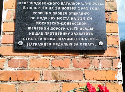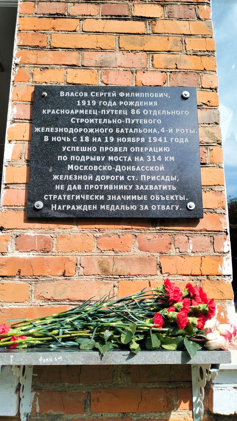 Заместитель председателя городского совета ветеранов по поисковой работе Барышников Евгений Иванович, изучая историю 86 Отдельного Строительно-Путевого железнодорожного батальона, участвовавшего в обороне Тулы в 1941 году, нашел информацию о подвиге красноармейца Власова Сергея Филипповича, который в ночь с 18 на 19 ноября 1941 года произвел подрыв моста на 314 км Московско-Донбасской железной дороги станции Присады, помешав противнику захватить стратегически значимые объекты. За этот подвиг Власов Сергей Филиппович был награжден медалью "За отвагу".Эта информация была передана в Тульское региональное отделение Общероссийской общественно-государственной организации "Российское военно-историческое общество в Тульской области". С их помощью 1 сентября 2023 года на стене школы станции Присады была установлена мемориальная доска красноармейцу-путейцу Власову Сергею Филипповичу.