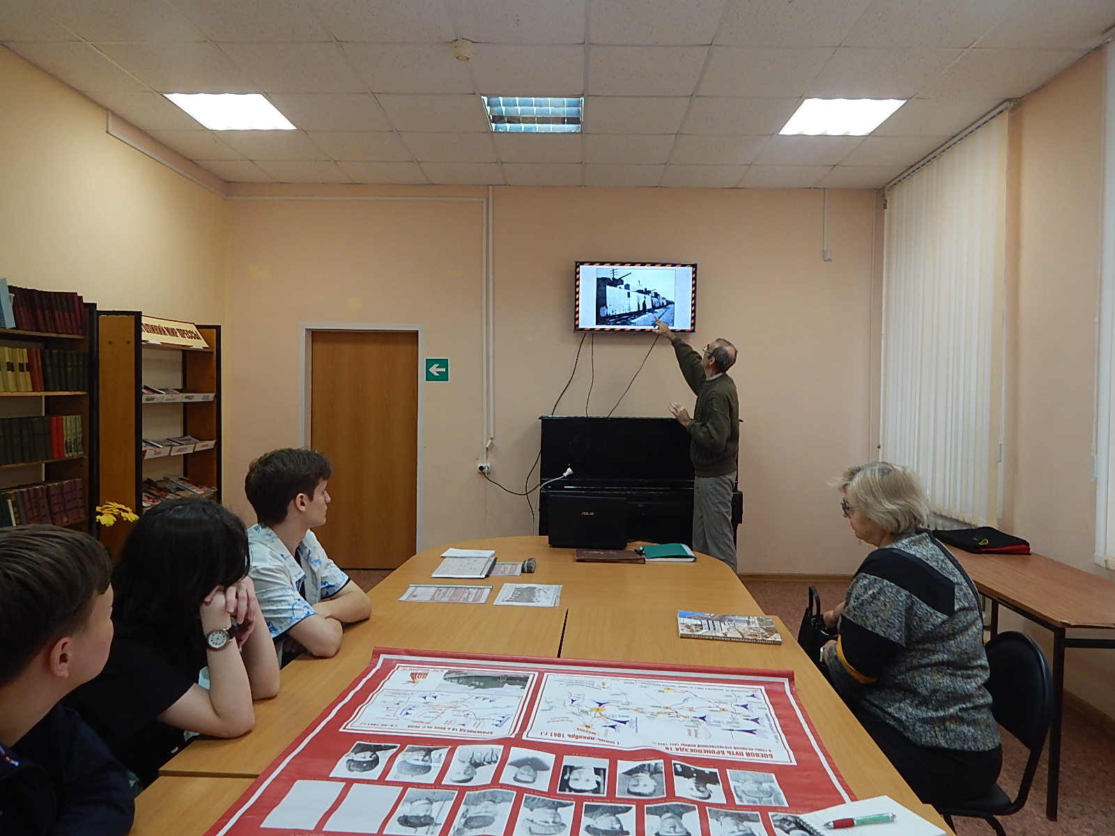 Барышников Евгений Иванович рассказал ребятам о боевом пути бронепоезда №16, передал им карты движения и материалы по команде бронепоезда – результат своей поисковой работы, с целью продолжить совместную работу в этом направлении.