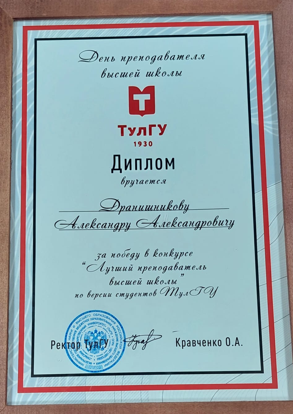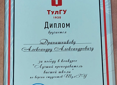 17 ноября 2023 года в ТулГУ прошло Торжественное собрание, посвященное празднованию 19 ноября Дня преподавателя высшей школы, в котором принял участие член бюро городского Совета ветеранов Александр Александрович Дранишников. Ректором ТулГУ О.А. Кравченко он был награжден Дипломом за победу в конкурсе "Лучшему преподавателю высшей школы".