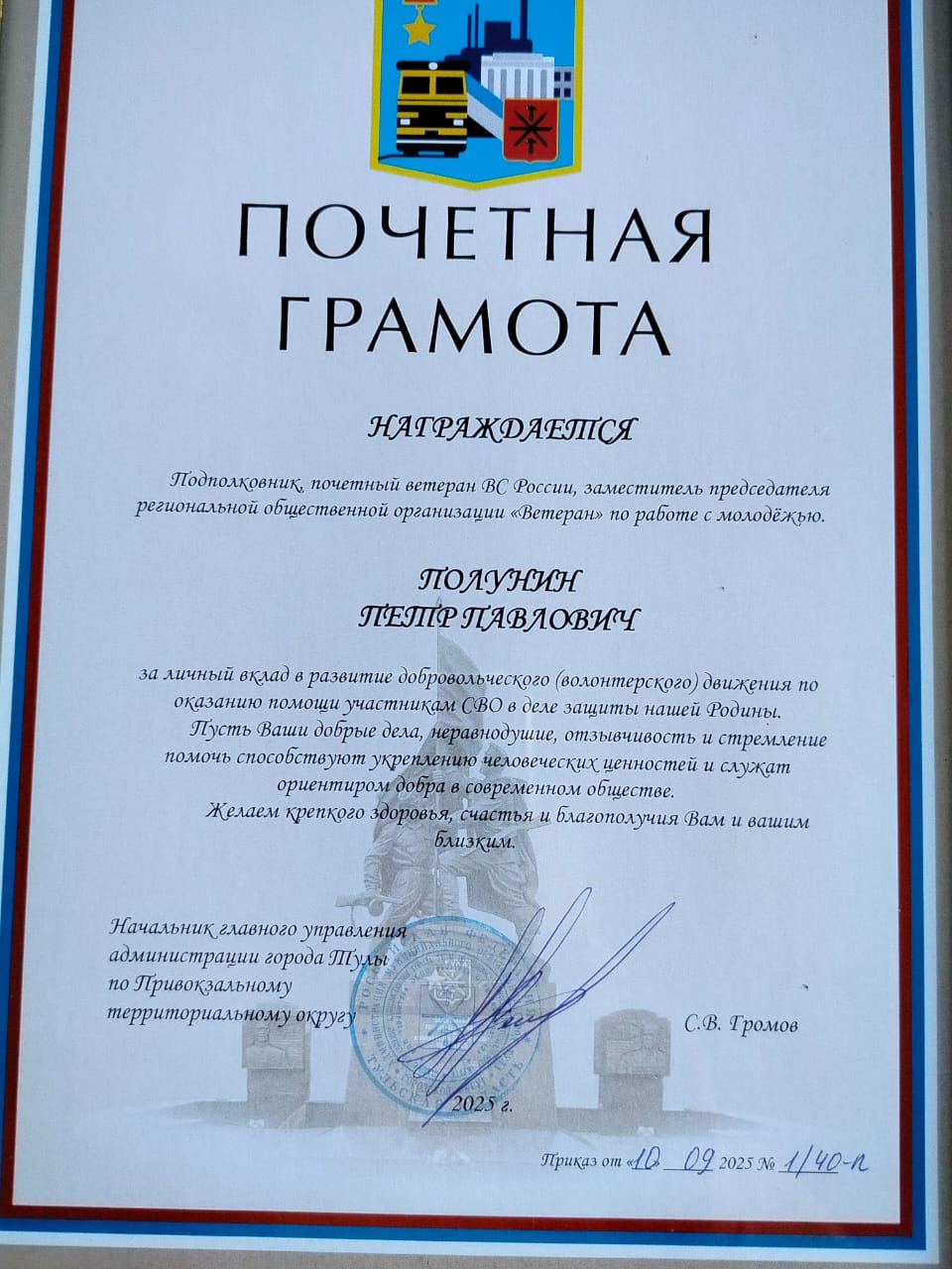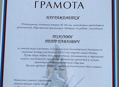 с заслуженным признанием его большого вклада в дело патриотического воспитания молодежи и в развитие добровольческого (волонтерского) движения по оказанию помощи участникам СВО в деле защиты нашей Родины и награждением Грамотой начальника главного управления администрации города Тулы по привокзальному территориальному округу.