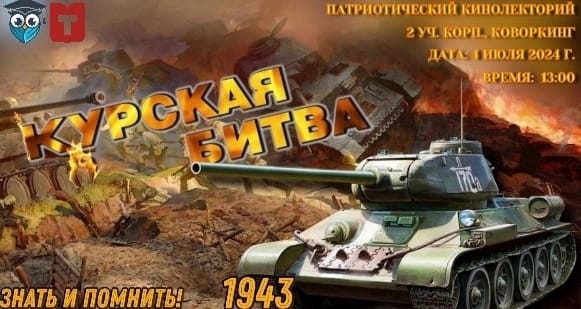 4 июля 2024 года под руководством члена ТРОО "Ветеран", кандидата исторических наук, доцента кафедры «История государства и права» института права и управления ТулГУ Александра Александровича Дранишникова прошел Патриотический кинолекторий, посвященный 81-ой годовщине Курской битвы.