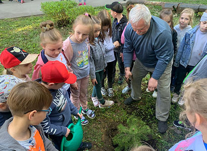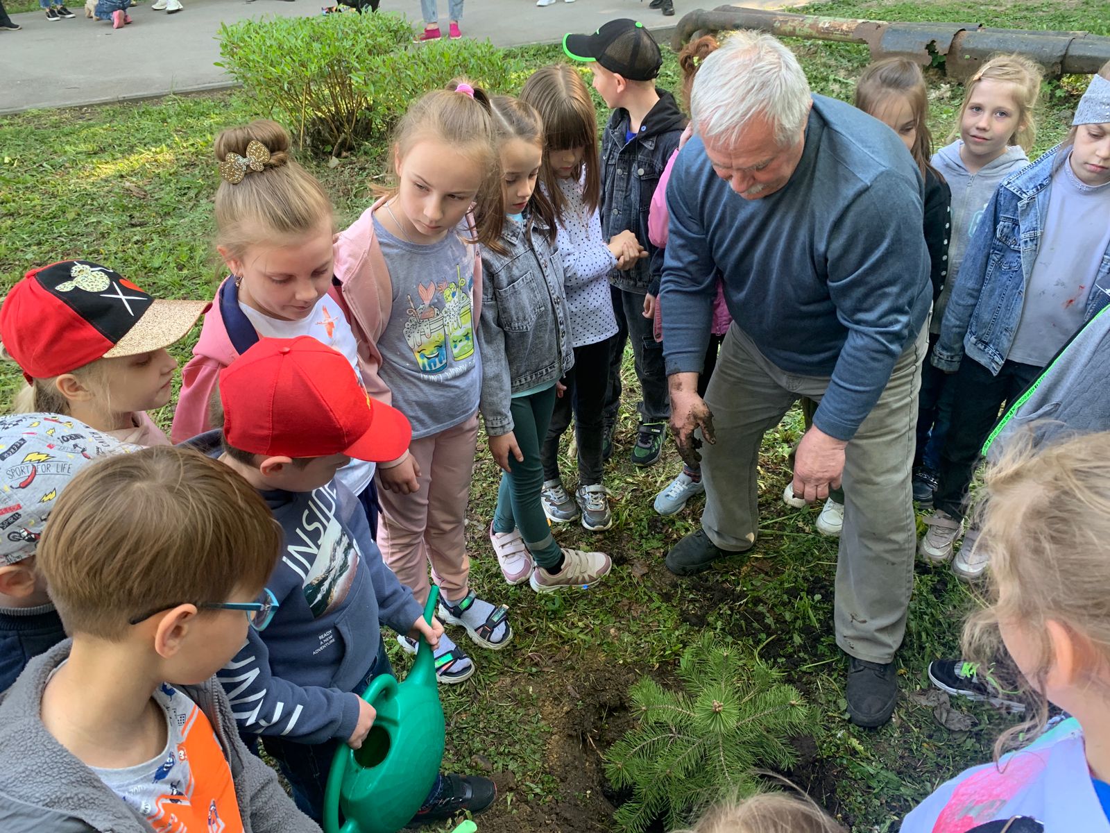 Заместитель председателя Городского совета ветеранов по работе с молодежью Петр Павлович Полунин вместе с первоклашками школы №65 посадил цветы и деревья в Косогорском парке г.Тулы.