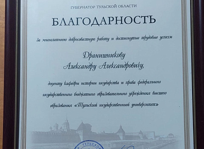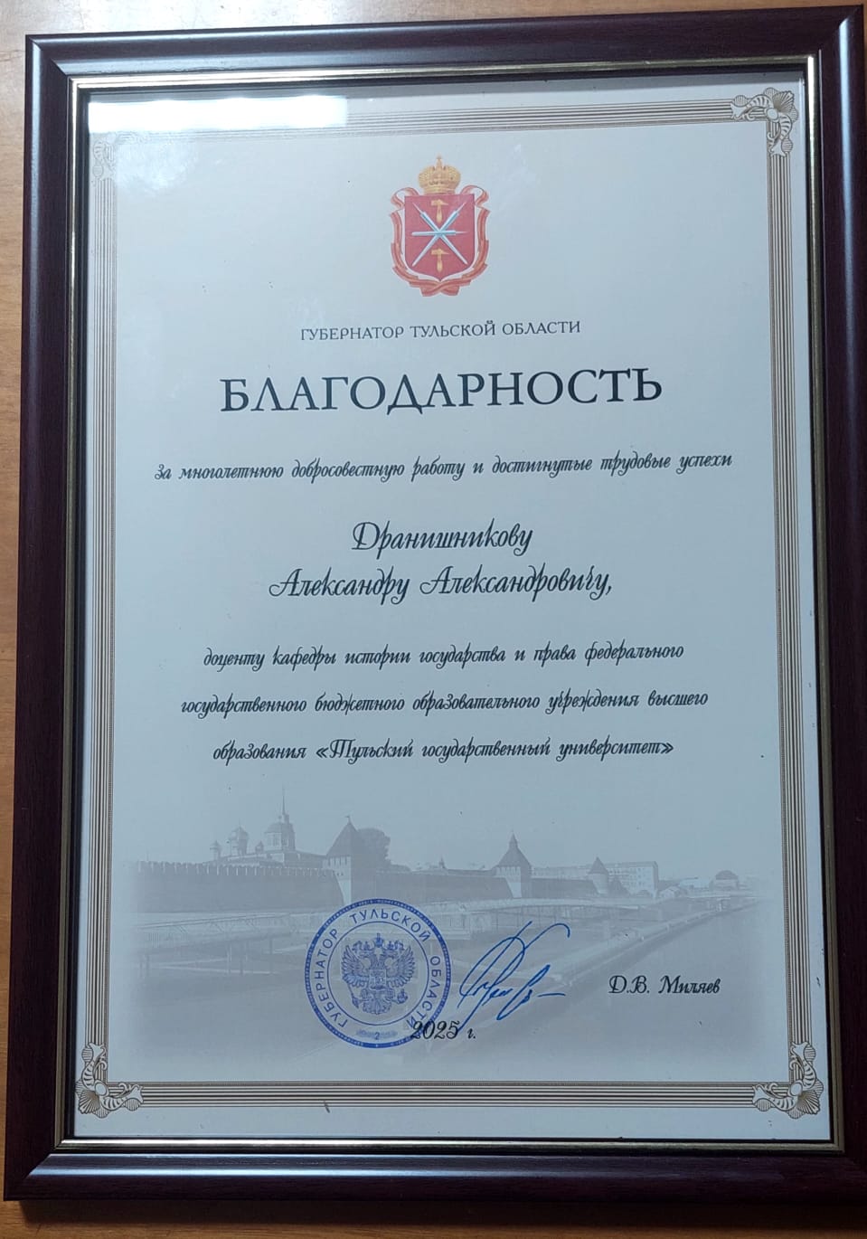 — доценту кафедры «История государства и права» Института права и управления, члену Тульской региональной общественной организации "Ветеран" Александру Александровичу Дранишникову.