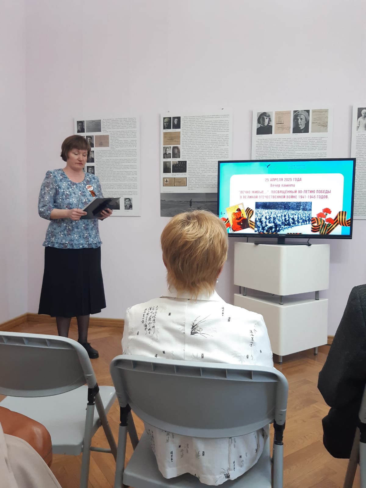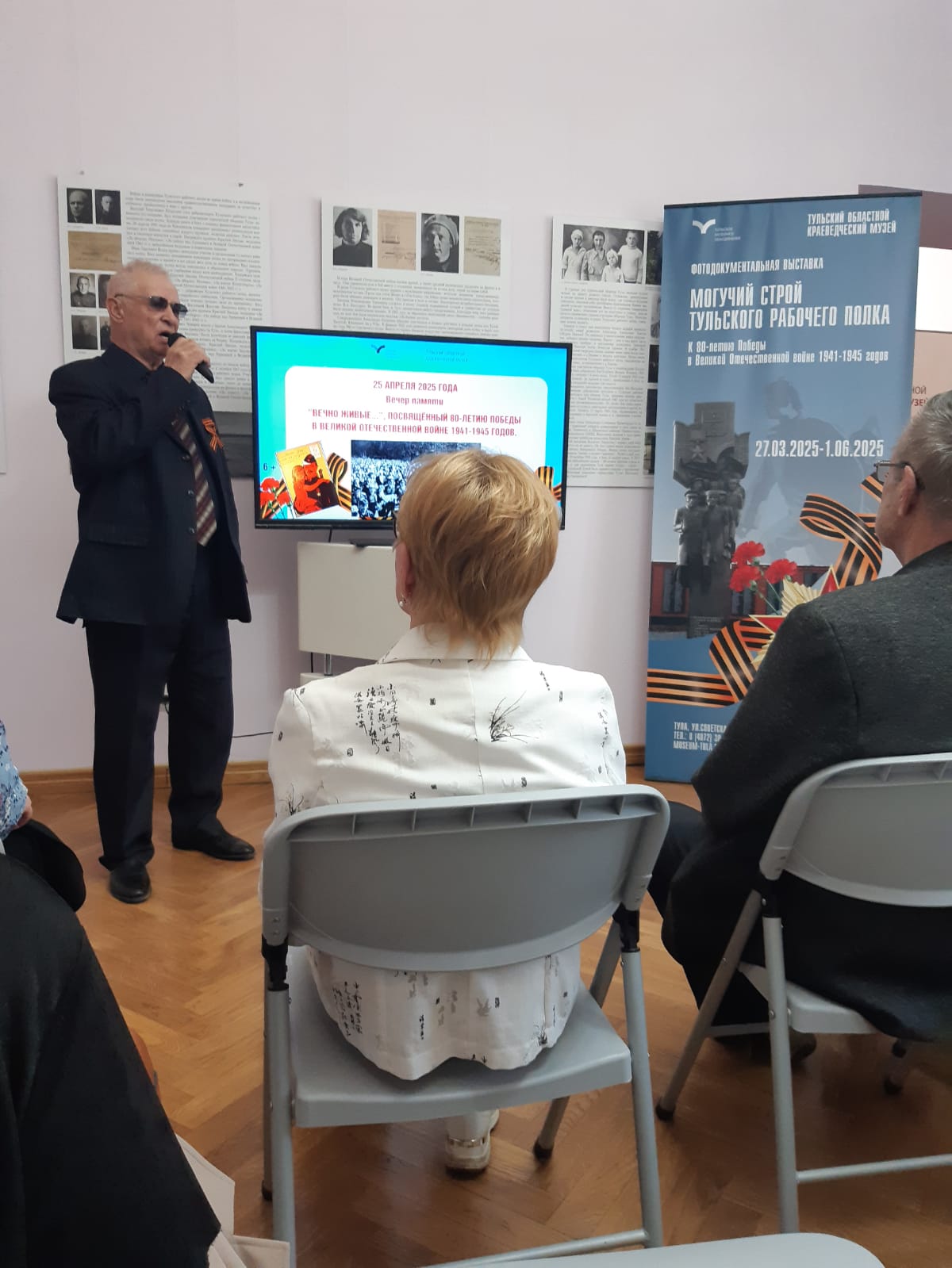 25 апреля 2025 г. в Тульском областном краеведческом музее прошел вечер памяти «Вечно живые», посвященный 80-летию Победы в Великой Отечественной войне 1941-1945 г.г., в котором приняли участие члены Тульской региональной общественной организации «Ветеран».