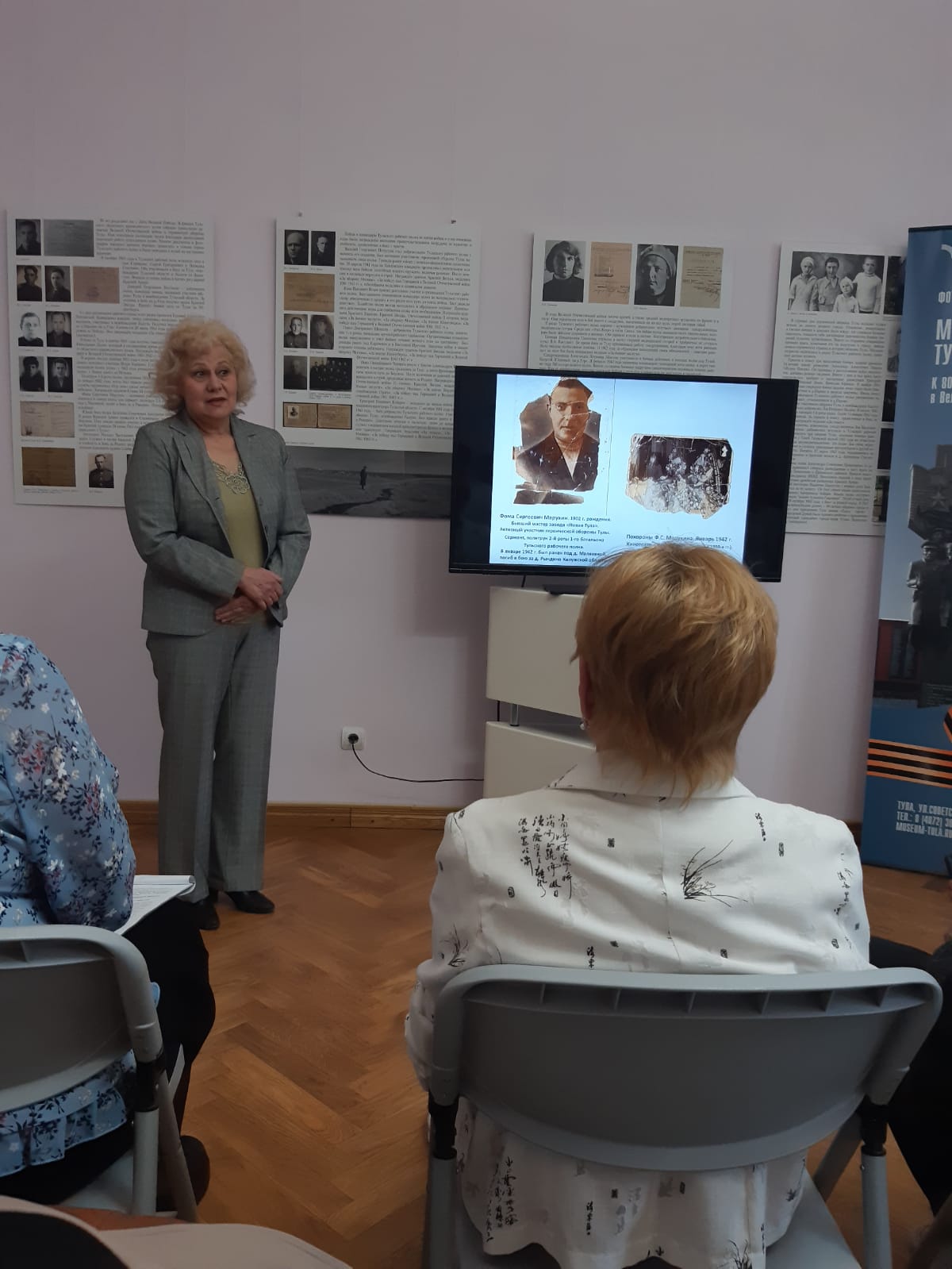 Авдеева Ирина Геннадьевна рассказала о своем деде Марухине Фоме Сергеевиче, политруке 2-й роты 1-го батальона Тульского рабочего полка. Рассказала о том, как долго искала место его захоронения и нашла его на «Салунском кладбище» Тулы. Показала фото деда из семейного альбома
