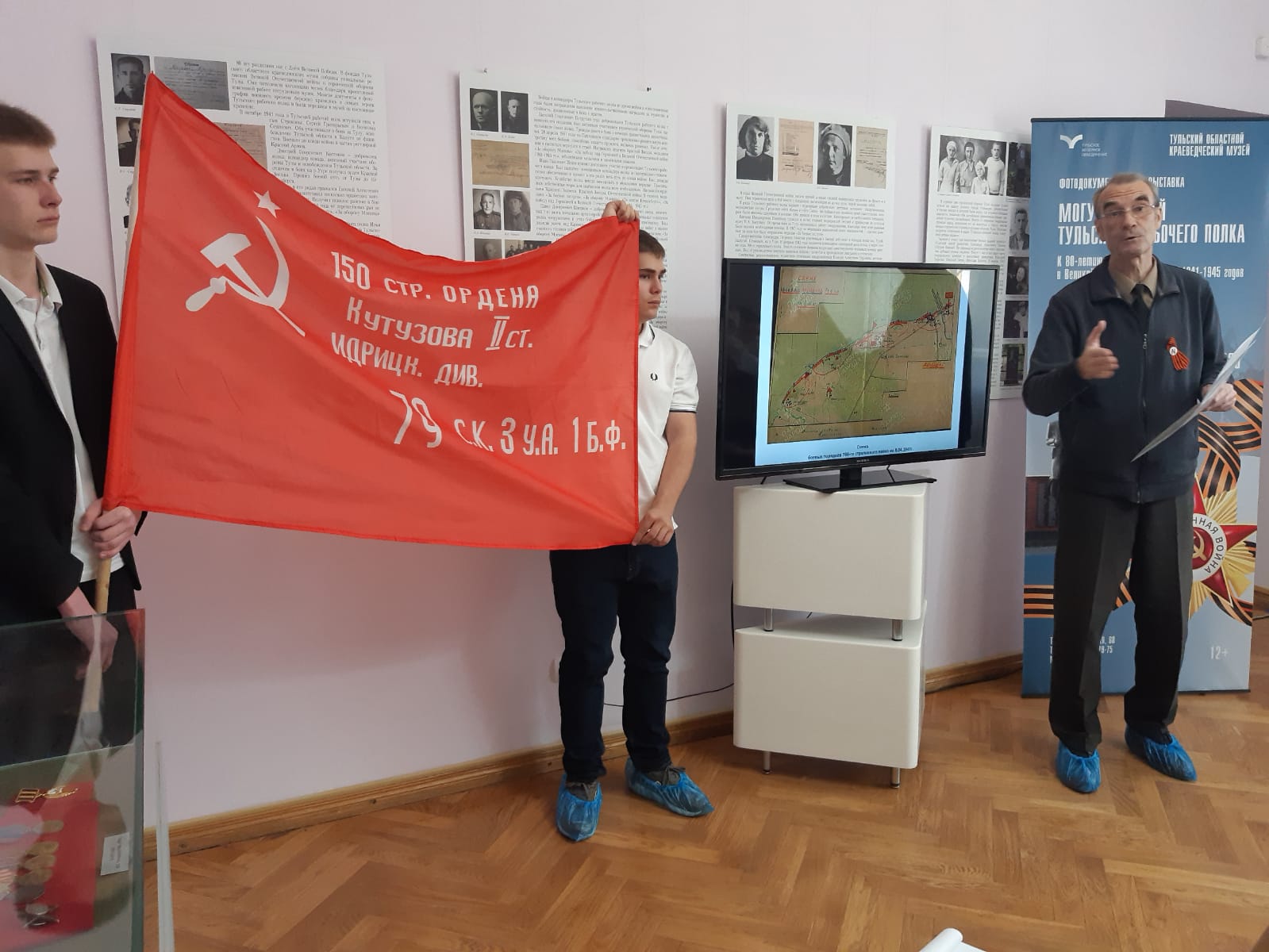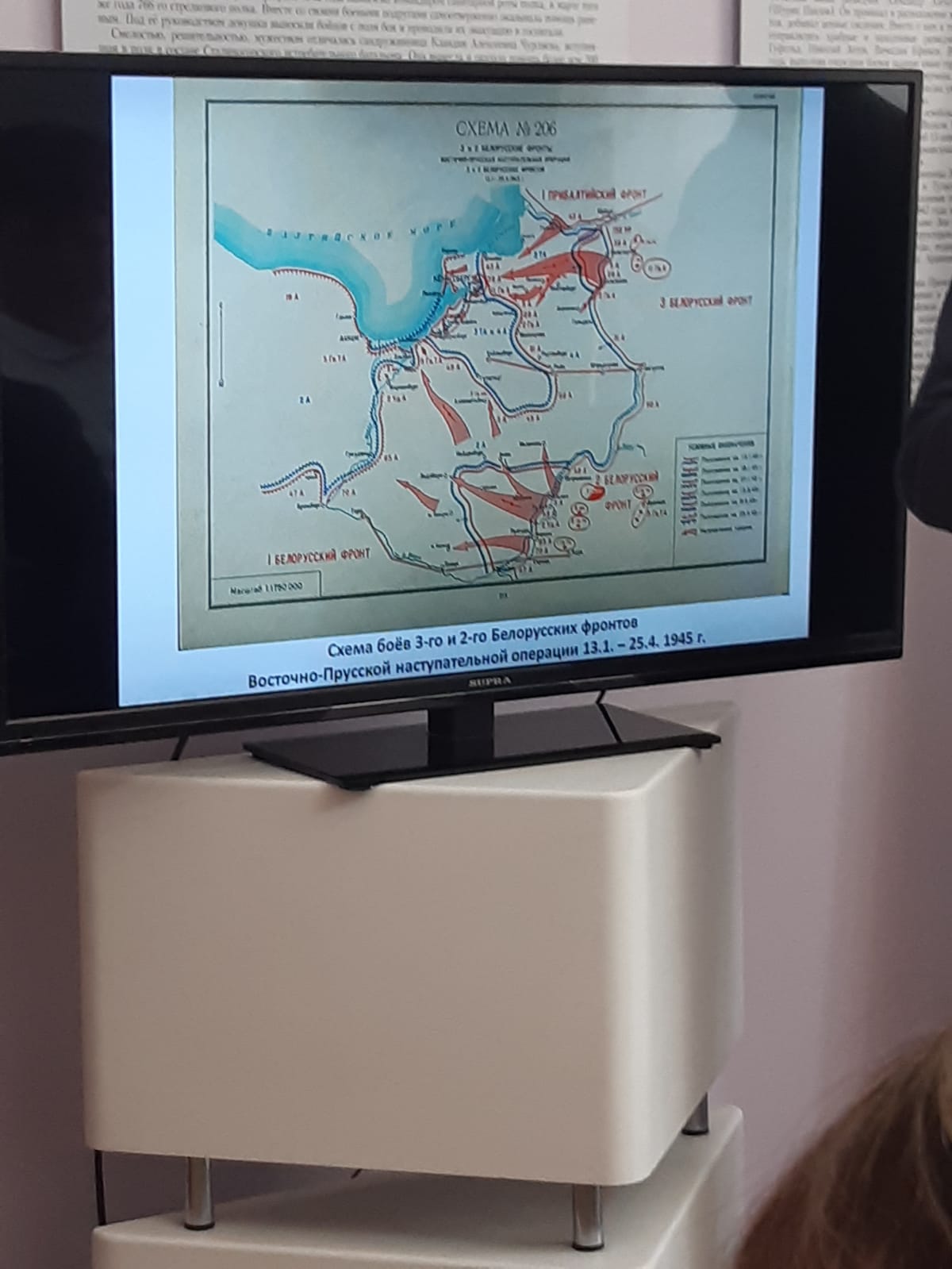 Заместитель председателя ТРОО «Ветеран» Барышников Евгений Иванович рассказал о своем отце – фронтовике сержанте Барышникове Иване Николаевиче. Рассказал о его боевом пути. Показал фото отца из семейного альбома. Рассказал о последнем сражении Тульского рабочего полка в 1945 г. в Восточной Пруссии. Там, где воевали, погибали и побеждали воины – туляки. Там, где водрузили знамя Победы на берегу Балтийского моря. Показал схему боев 3-го и 2-го Белорусских фронтов в Восточно – Прусской наступательной операции 13.1 – 25.04.1945 г. Рассказал о продолжении поисковой работы в этом направлении.
