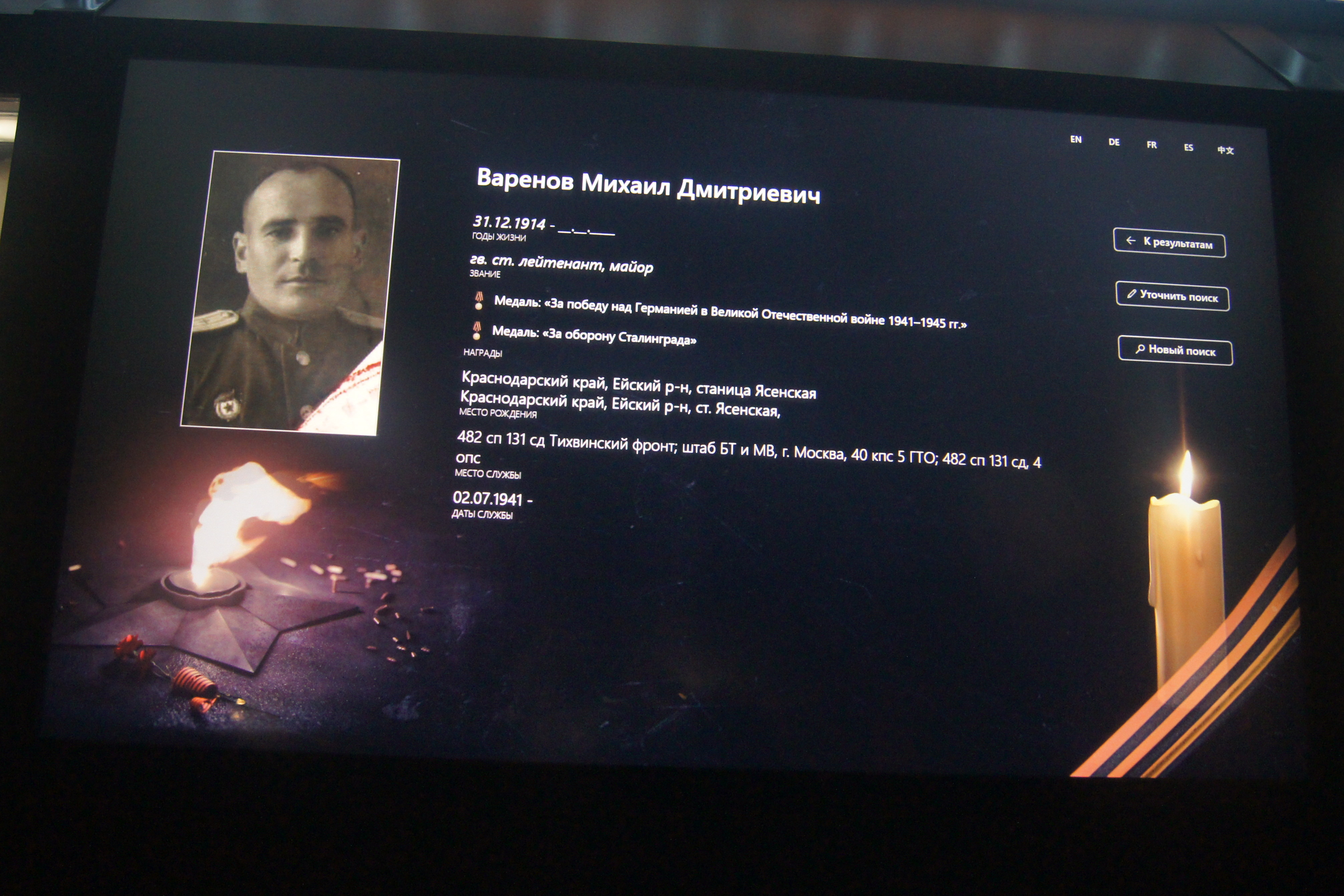 При посещении музейного комплекса «Дорога памяти» он получил массу знаний по Великой Отечественной войне 1941-1945гг. Но была в этой экскурсии и удивительная встреча. На интерактивном стенде можно было получить информацию о своих родственниках-участниках войны. И Владик нашел не только информацию о своем прадедушке-танкисте, майоре Варёнове Михаиле Дмитриевиче, но и его фотографию, которой нет в семейном архиве.