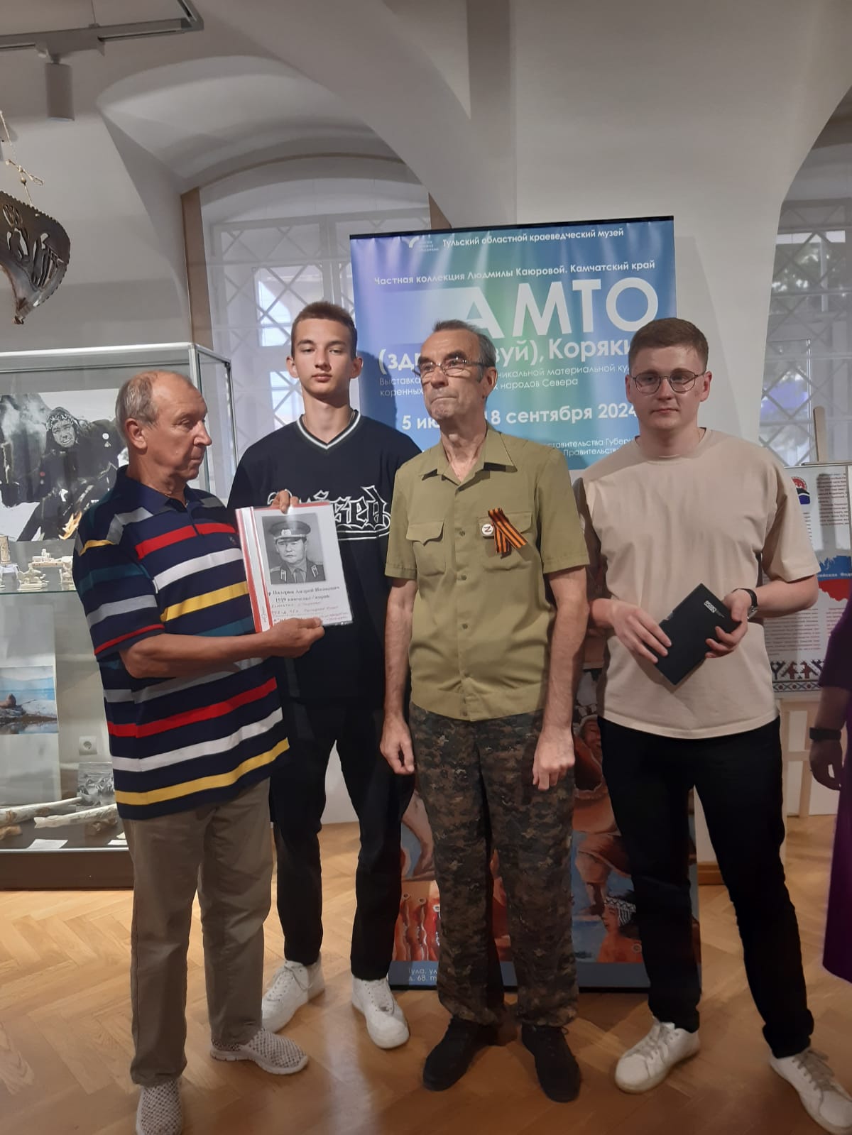 Барышников Е.И., заместитель председателя ТРОО «Ветеран» по поисковой работе, при участии студентов тульского филиала РЭУ им. Плеханова, передали гостям с Камчатки документы на майора Падерина Александра Ивановича,1919г.р., камчедала/коряка, воевавшего во время Великой Отечественной войны в 342 стрелковой дивизии, 1 А Западного фронта на Тульской земле, в Белевском районе.
